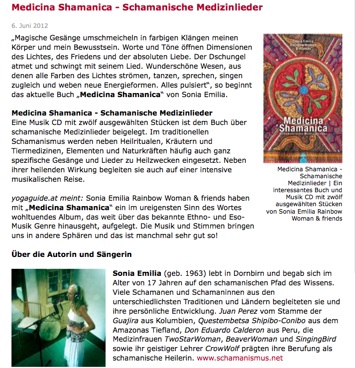 „Magische Gesänge umschmeicheln in farbigen Klängen meinen Körper und mein Bewusstsein. Worte und Töne öffnen Dimensionen des Lichtes, des Friedens und der absoluten Liebe. Der Dschungel atmet und schwingt mit seinem Lied. Wunderschöne Wesen, aus denen alle Farben des Lichtes strömen, tanzen, sprechen, singen zugleich und weben neue Energieformen. Alles pulsiert“, so beginnt das aktuelle Buch „Medicina Shamanica“ von Sonia Emilia. Bericht